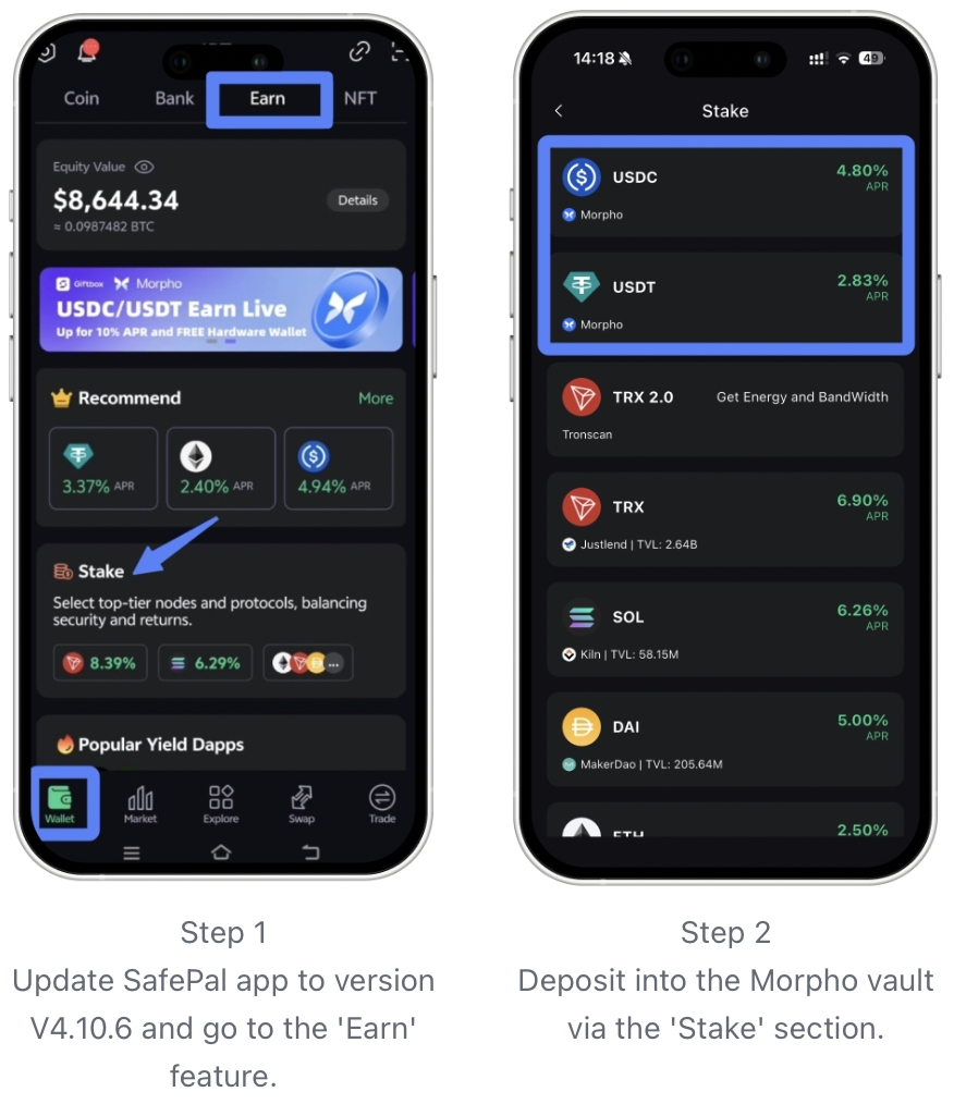 Update SafePal app to version V4.10.6 → Go to the 'Earn' feature → Deposit into the Morpho vault via "Stake" section.