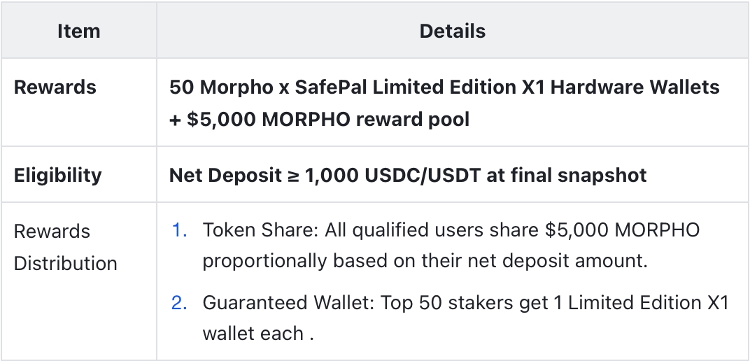 Reward Pool 2 (for top 50 stakers): $5000 MORPHO reward pool and 50 SafePal Limited Edition X1 Hardware Wallets