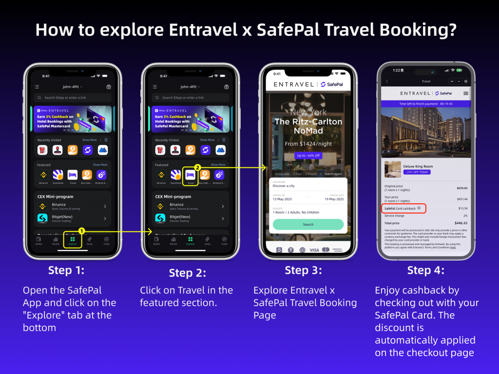Dünya çapında 2.2 milyon otel için nakit para iadesi ve %60'a varan indirimli fiyatlarla rezervasyon yapmak için SafePal x Entravel Seyahat Rezervasyon Sayfası web sitesini ziyaret edin veya SafePal uygulamasındaki "öne çıkan bölüm" veya banner'da gösterilen Seyahat dapp'ını seçin ve ödeme işlemini SafePal Mastercard ile gerçekleştirin (SafePal bankacılık geçidi ve Mastercard hakkında daha fazla bilgi için kullanıcılar www.safepal.com/bank adresine başvurabilir veya blogu buradan okuyabilirler).