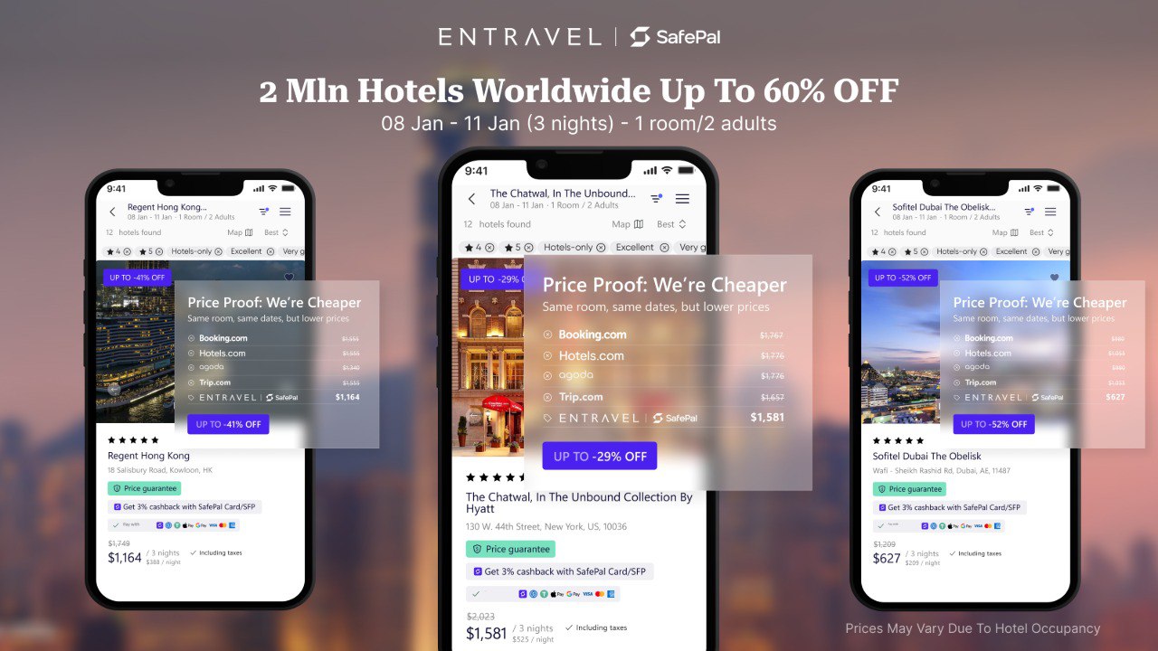 SafePal × Entravel Seyahat Rezervasyonu, tüm SafePal kullanıcılarına 2.2 milyon lüks otel ve tatil köyü dünya çapında %60'a varan özel indirimli fiyatlara erişim sağlayan kripto dostu bir otel ve uçak rezervasyon platformudur, yakında küresel uçuş rezervasyon seçenekleri de eklenecektir.