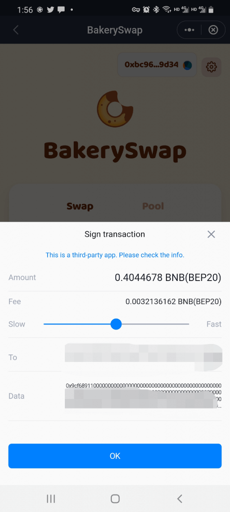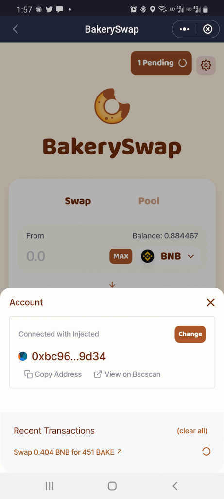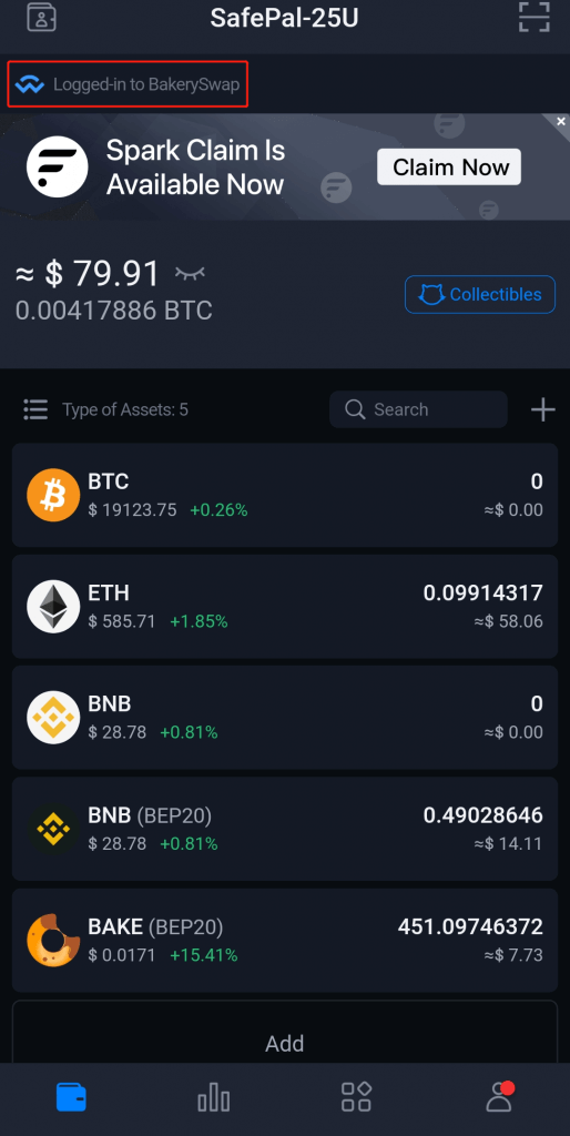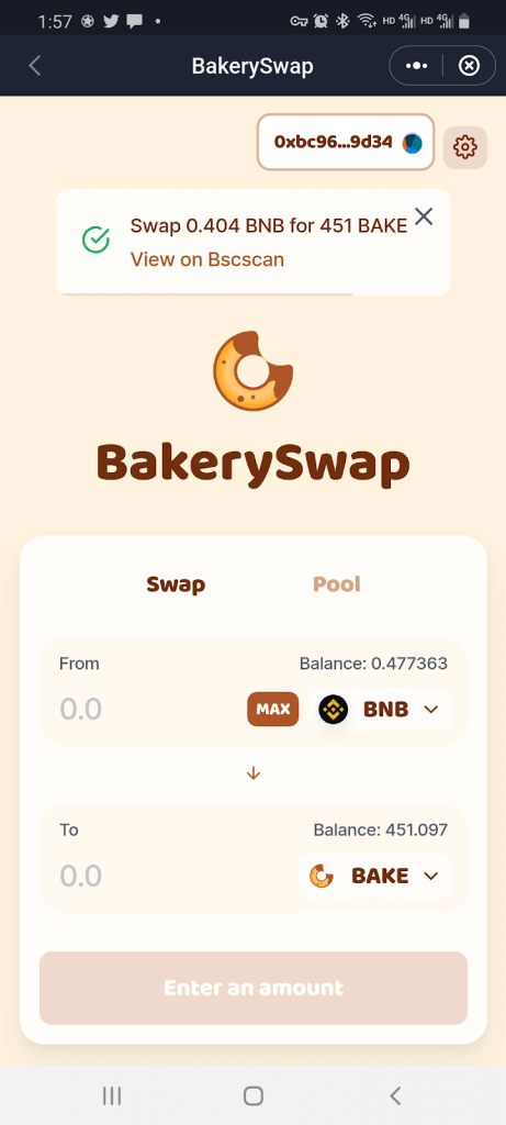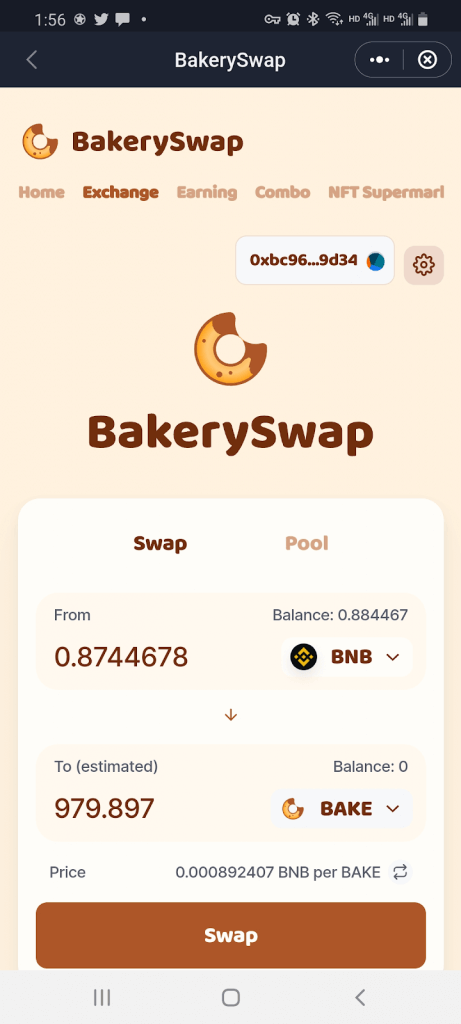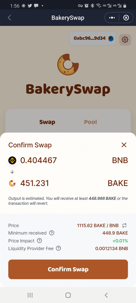 Step 3: BakerySwap will have automatically connected to your SafePal Wallet