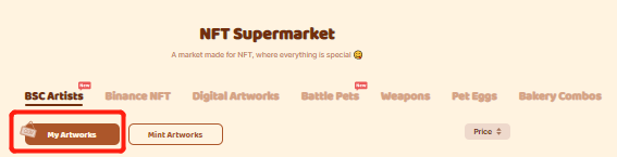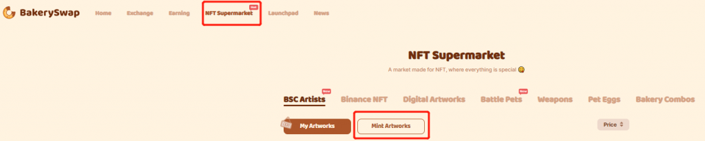 On the BakerySwap Website, select NFT Supermarket followed by the Mint Artwork tab shown below.