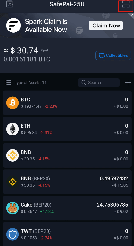 The scan button is located at the top right corner of the SafePal App displayed below
