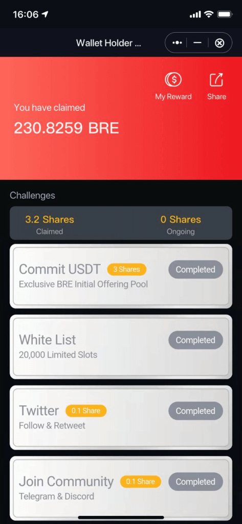 Each Participant’s BRE Reward = [5,000,000 BRE / Number Of Total Shares Completed ] * Number Of Shares Completed By Each Participant