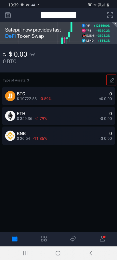 However, if you do not wish to receive ETH and would like to send and receive other coins or tokens. For example, if you wish to provide liquidity using other pairings for your DeFi protocol such as BAT. You must first add BAT to your wallet coin management page by selecting the pencil icon (highlighted in red).
